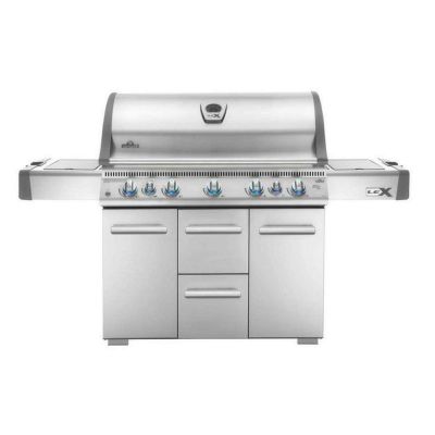 Grill gazowy ze stali nierdzewnej LEX730RSIB z serii LEX marki Napoleon z technologią I-Glow – podświetlanymi pokrętłami. Ma 7 palników, w tym palnik boczny i tylny na podczerwień oraz palnik ceramiczny.